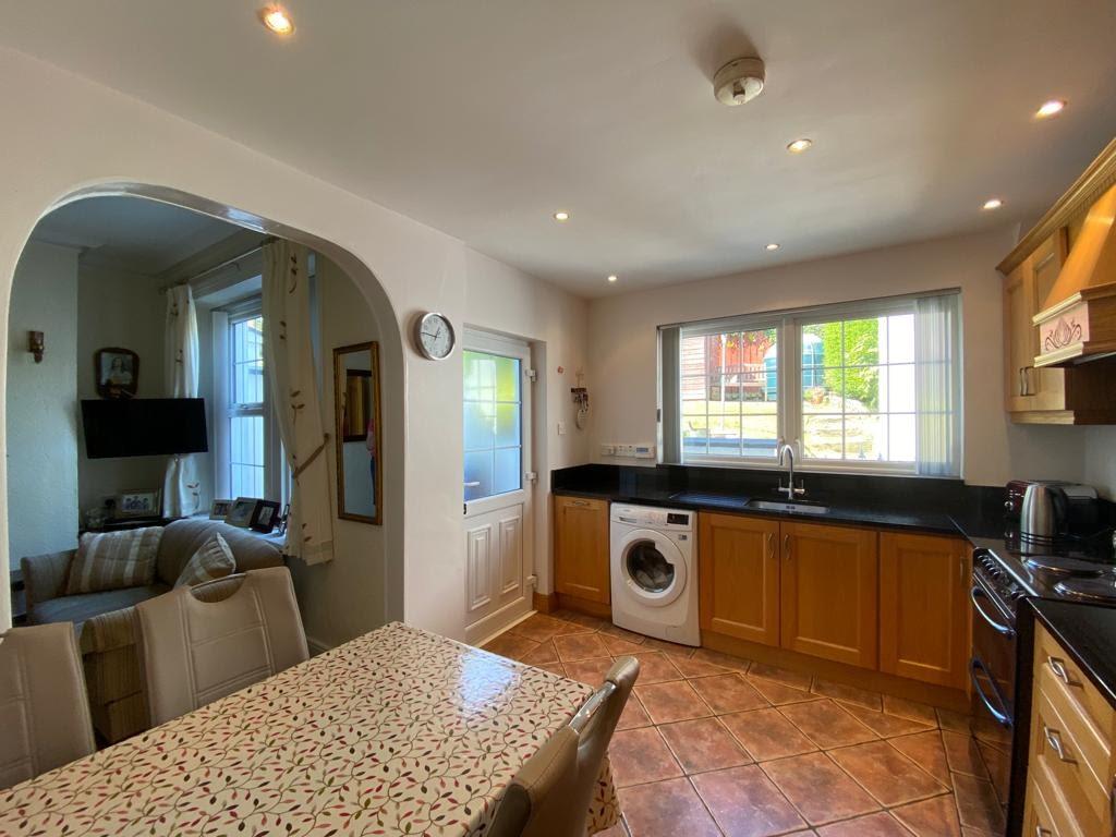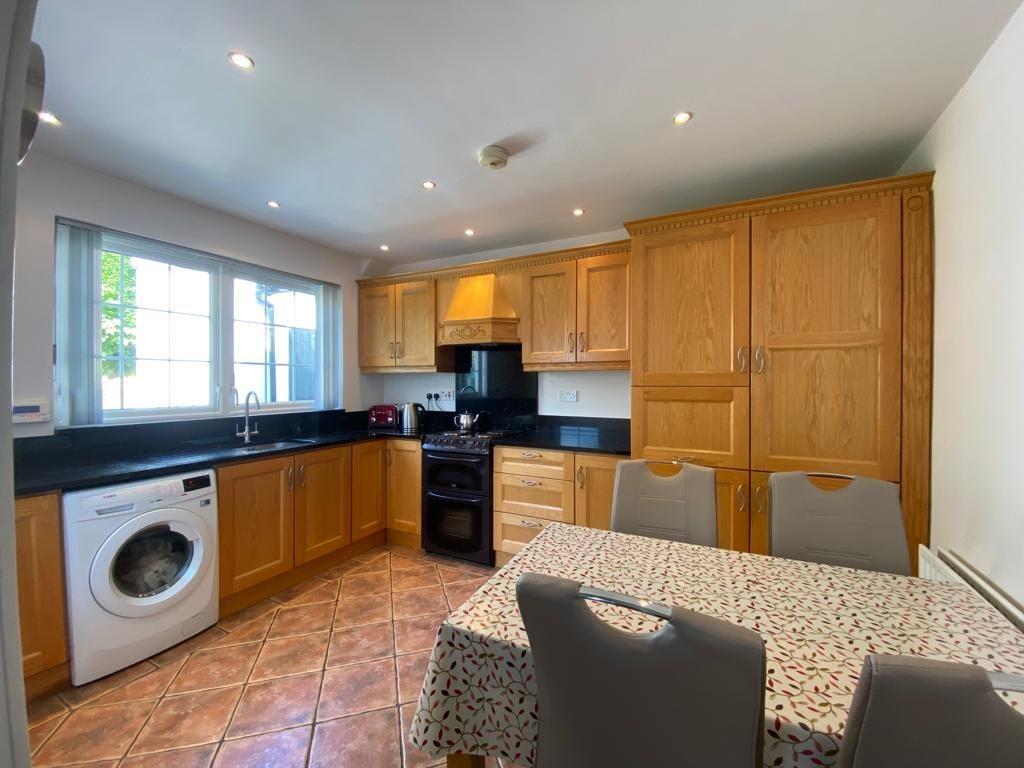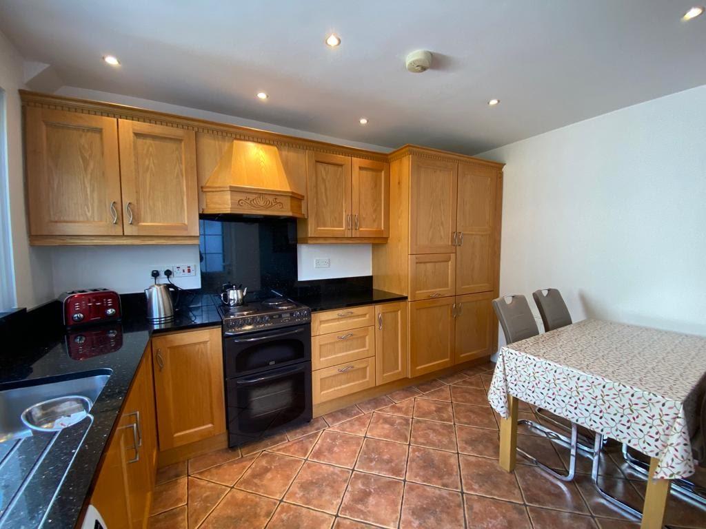 Having range of eye and low level units, stainless steel sink unit set in granite worktop with matching splashback, extractor canopy, cooker, plumbed for washing machine, integrated fridge/freezer and dishwasher, dining space, recessed lighting, tiled floor.