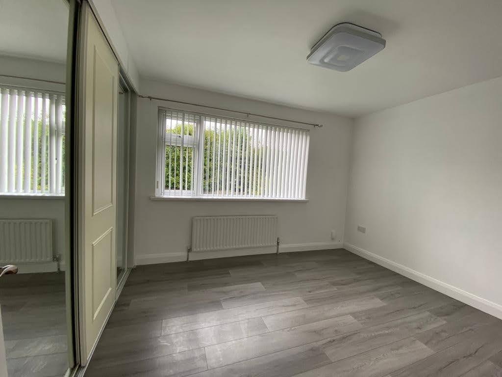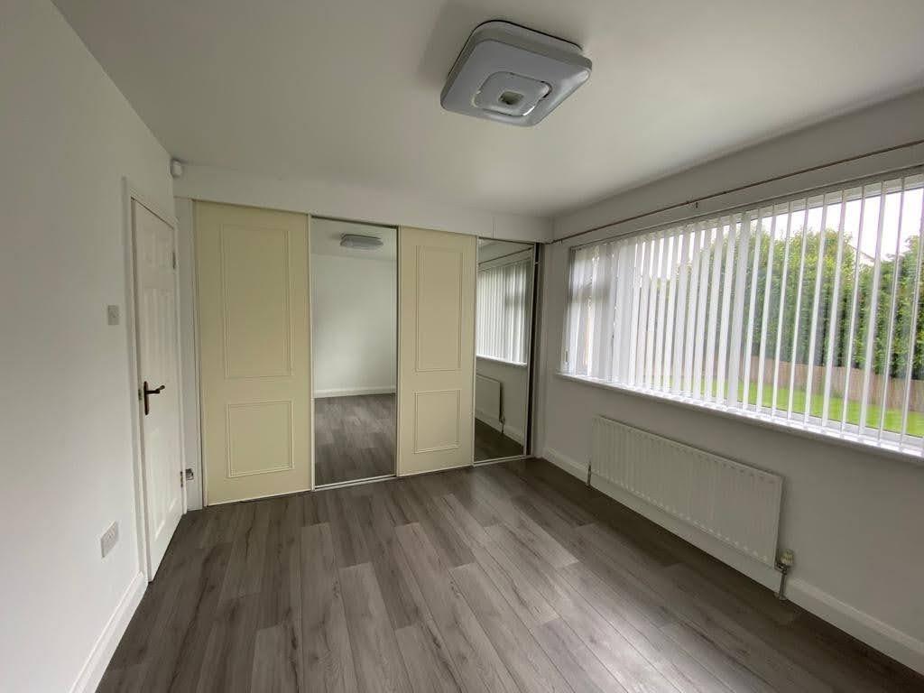 Having wall to wall wardrobes with sliding mirrored doors, laminated wooden floor.
