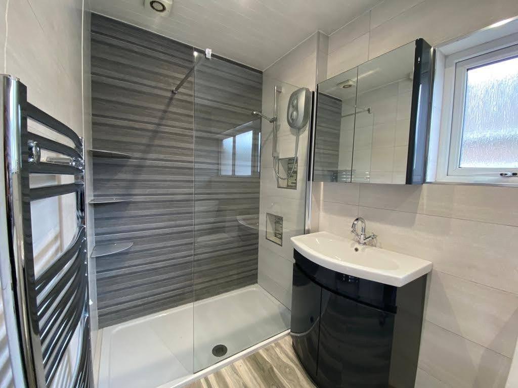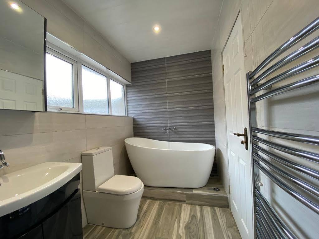 Comprising free standing bath, large walk in shower, whb set in vanity unit, wc, chrome radiator, recessed lighting, fully tiled walls and floor.