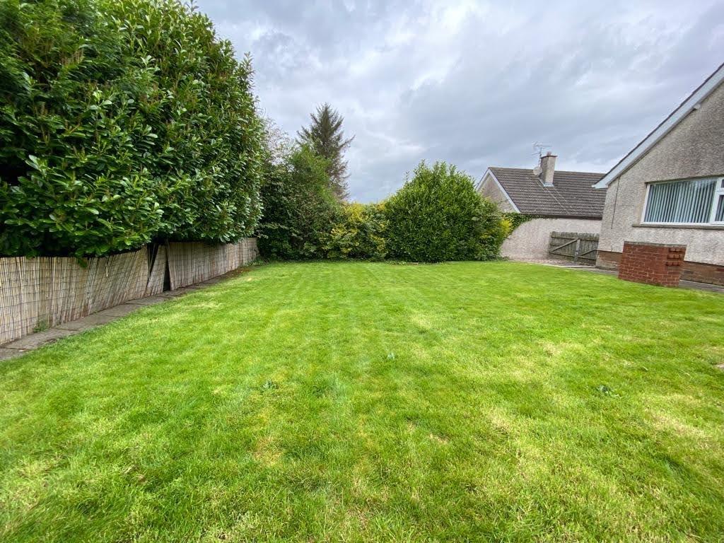 Lawn to rear bordered by mature plants, trees and shrubs.