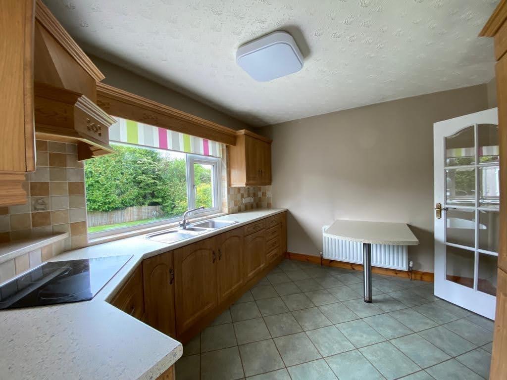 Having range of eye and low level units, tiling between units, matching corner extractor canopy and window pelmet, 1 1/2 bowl stainless steel sink unit with mixer taps, hob, double oven, integrated fridge/freezer and dishwasher, breakfast bar, tiled floor.
