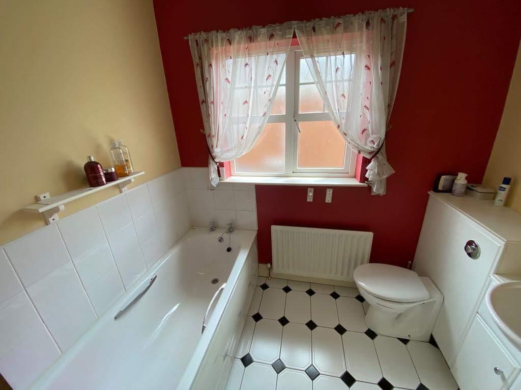 Comprising bath with tiling around, fully tiled walk in electric shower, whb vanity unit, wc, extractor fan, spot lights, tiled floor.