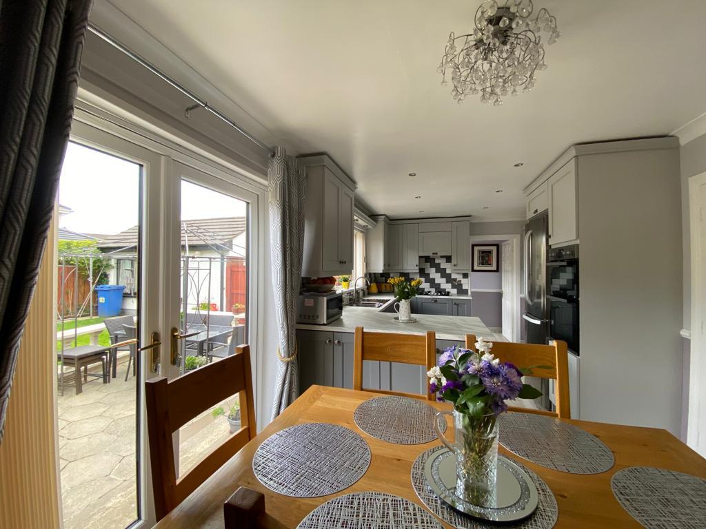 Having excellent range of eye and low level units, tiling between units, matching pelmet over window with lighting, 1 1/2 bowl stainless steel sink unit with mixer taps, gas hob, double oven, extractor hood, 'Amercian' style fridge / freezer, tiled floor, ample dining space with french doors, recessed ceiling lighting.