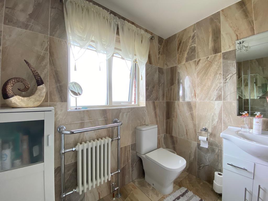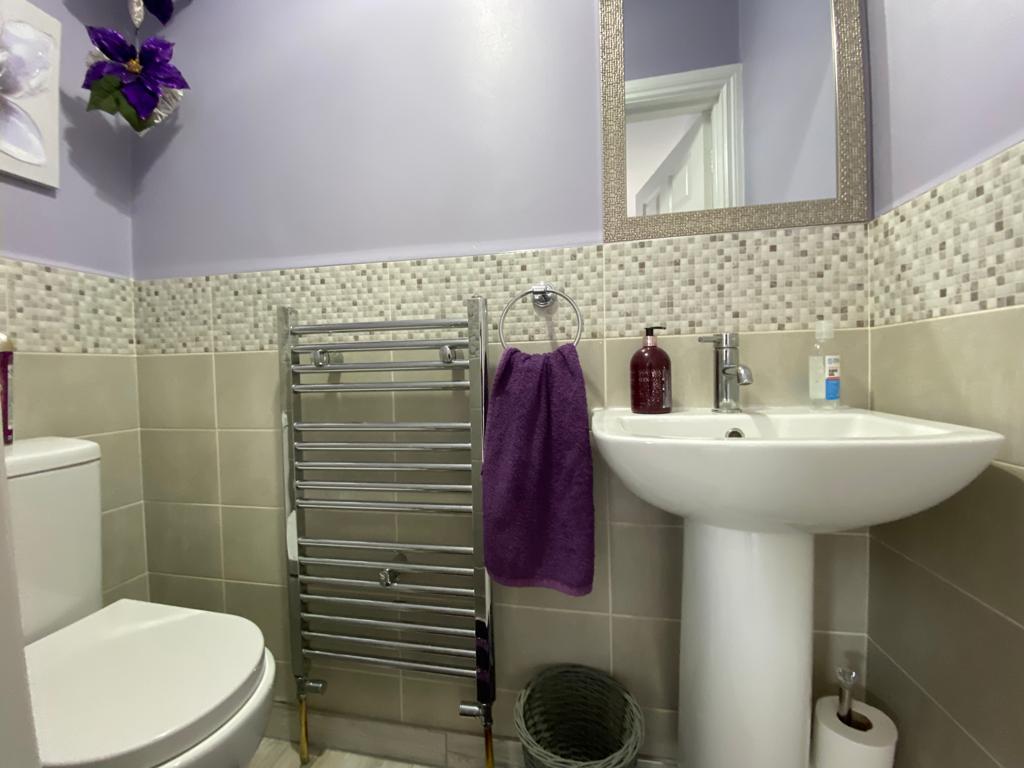Comprising whb and wc, chrome radiator, 1/2 tiled walls, tiled floor.