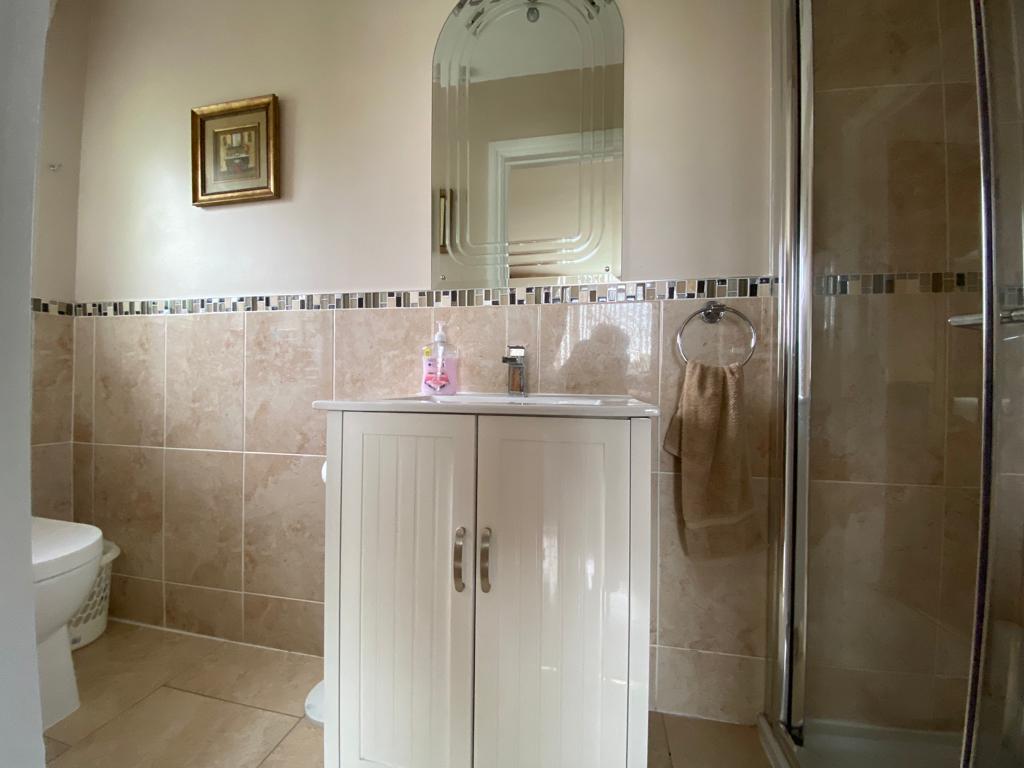 Comprising fully tiled walk in shower, whb set in vanity unit, wc, 1/2 tiled walls and tiled floor.