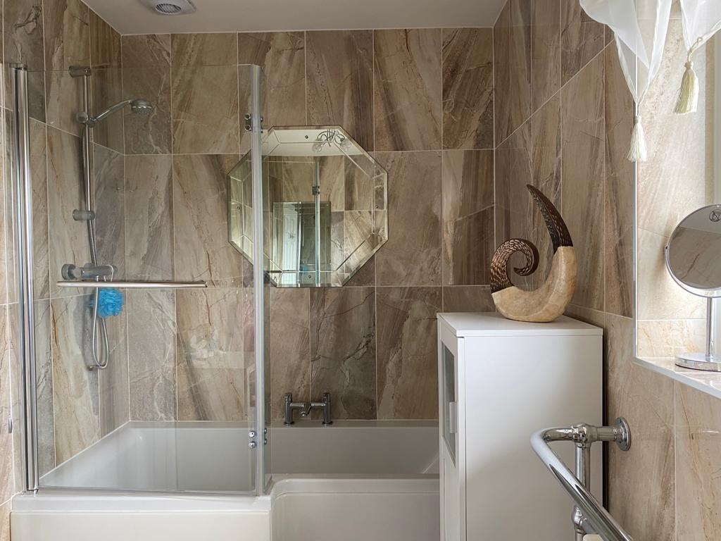Comprising bath with shower over, shower screen, whb set in vanity unit, wc, chrome radiator, fully tiled walls and floor.
