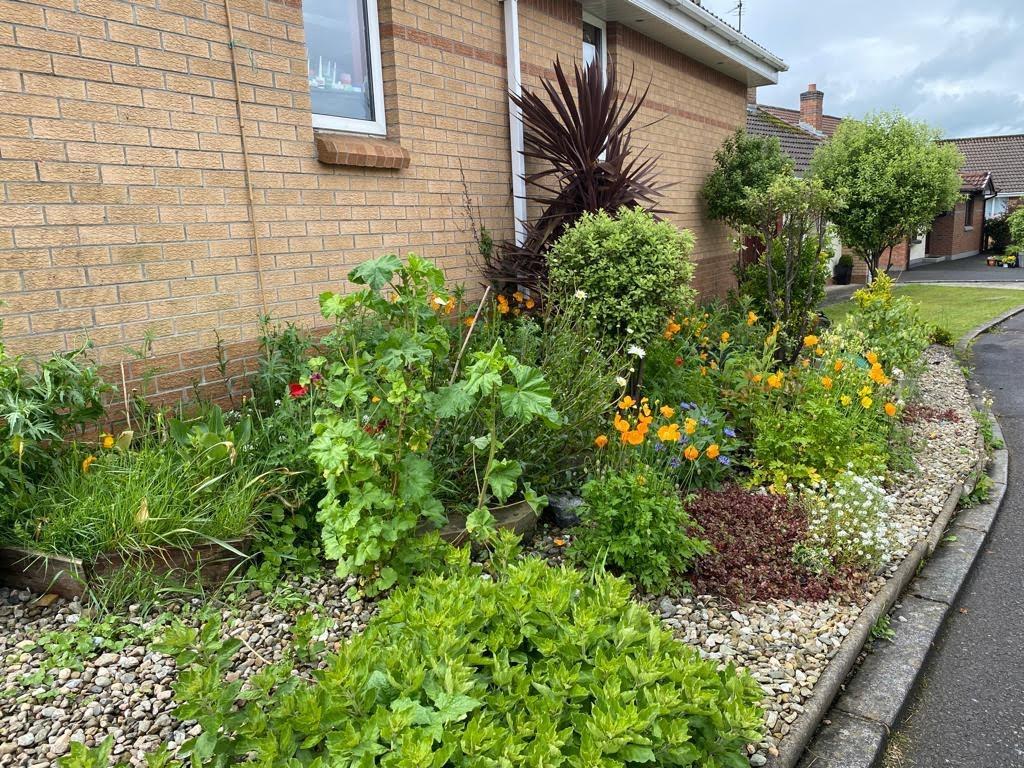Neat lawn to front with flower border to side.