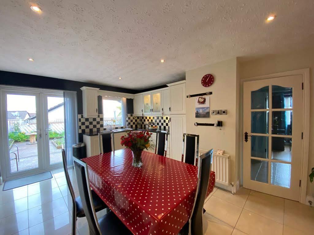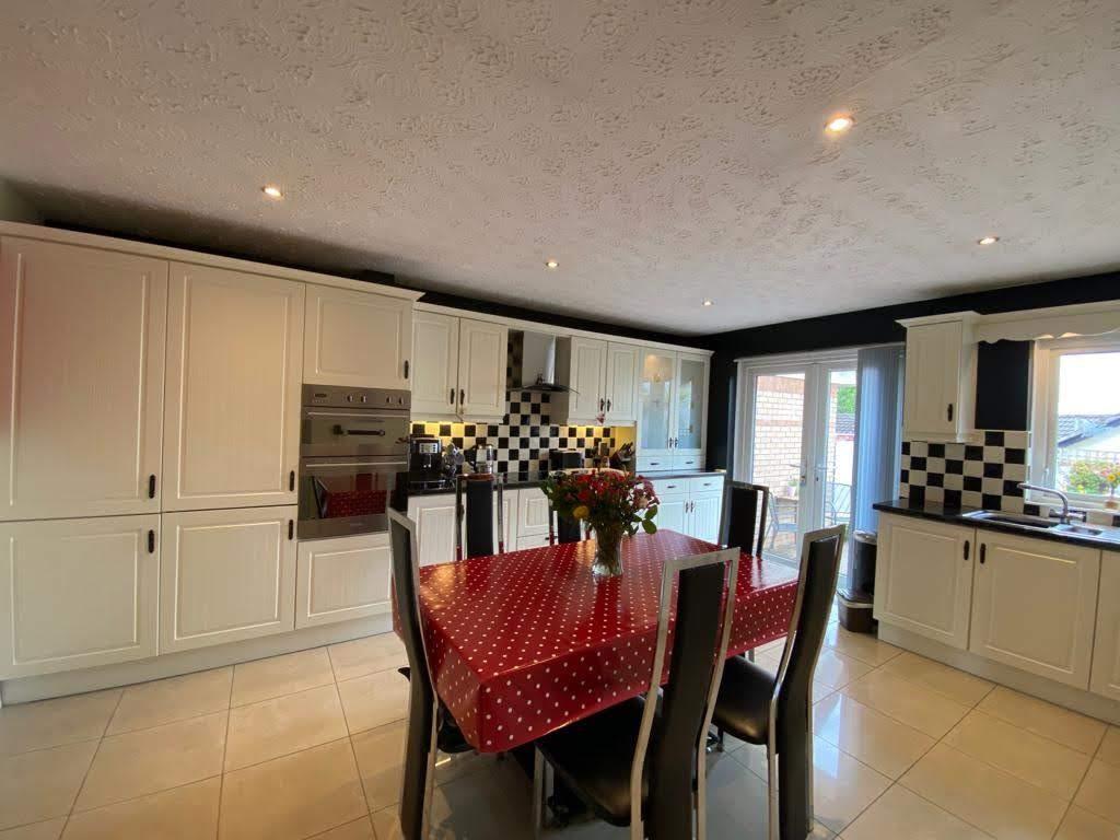 Having range of eye and low level units, tiling between units, hob, double oven, extractor hood, integrated fridge / freezer and dishwasher, recessed lighting, ample dining space with French doors leading to rear, tiled floor.