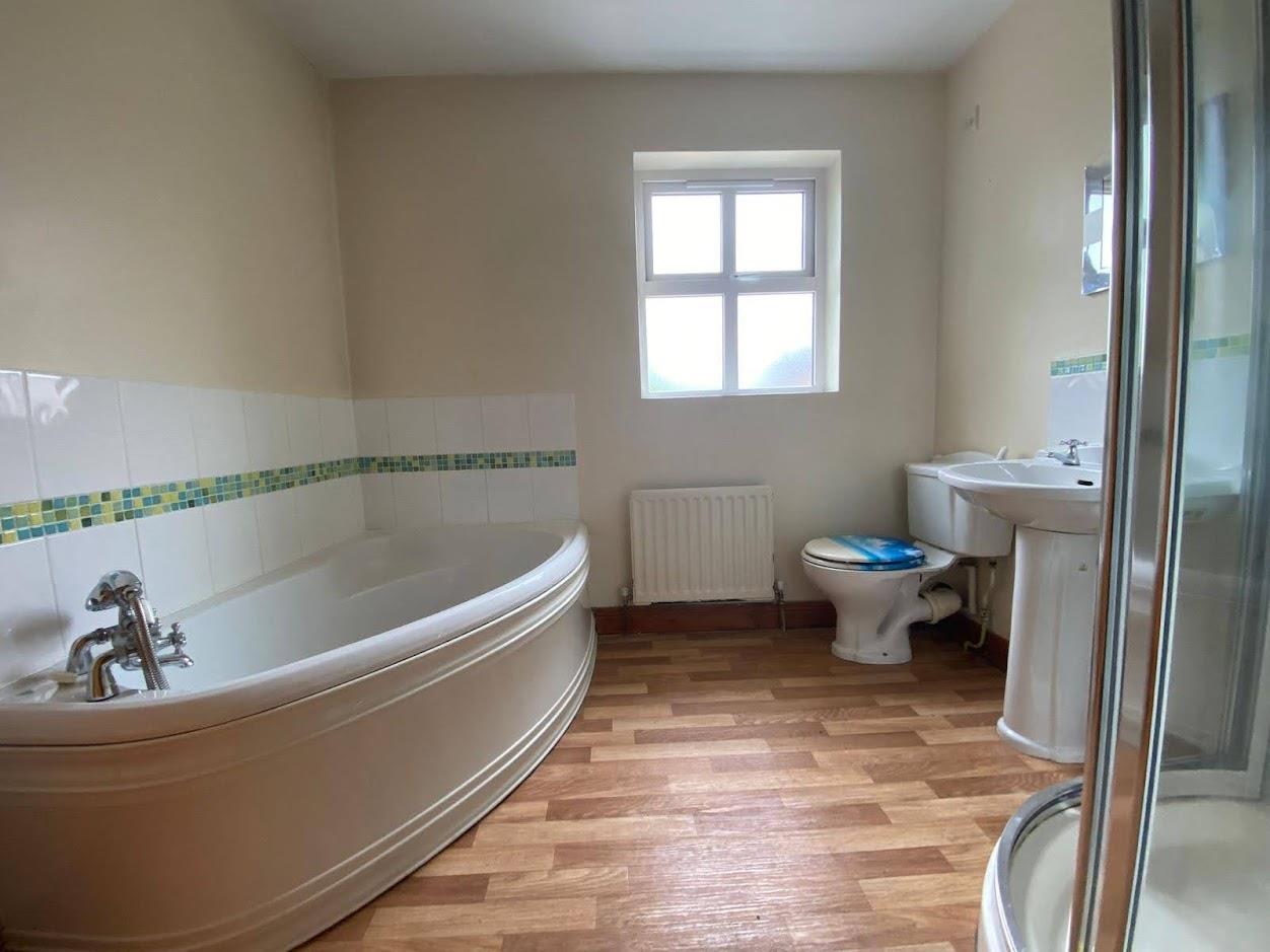 Comprising bath with shower attachment to taps and tiling around, fully tiled walk in electric shower, whb and wc, extractor fan.