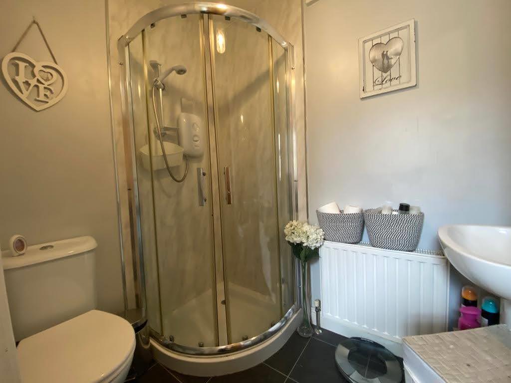 Comprising fully tiled walk in electric shower with PVC cladding, whb with PVC cladding around, wc, extractor fan.