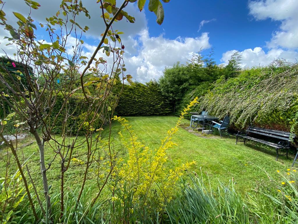 Lawn to rear bordered by conifers and enclosed by fence and gate.