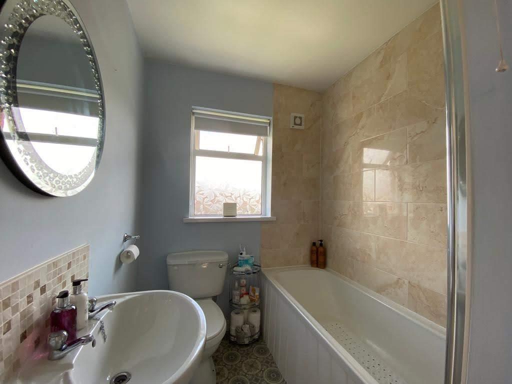 Comprising bath with electric shower over and tiling around, shower screen, whb and wc, laminate floor.