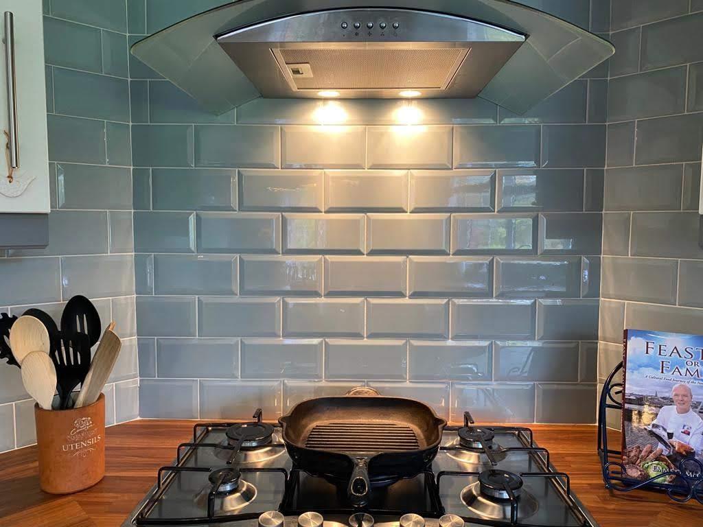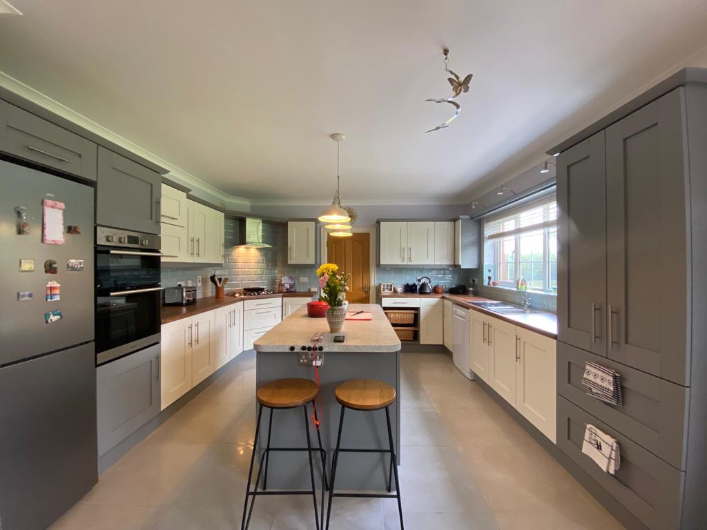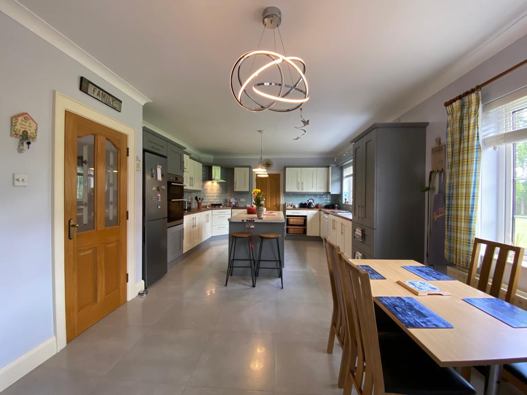 Having excellent range of eye and low level units, tiling between units, 1 1/2 bowl stainless steel sink unit with mixer taps, 5 ring gas hob, double oven, stainless steel extractor hood, larder, saucepan drawers, wicker vegetable baskets, space for fridge / freezer, plumbed for dishwasher, centre island with sink unit and storage under, pelmet over window with lighting, ample dining space, tiled floor.