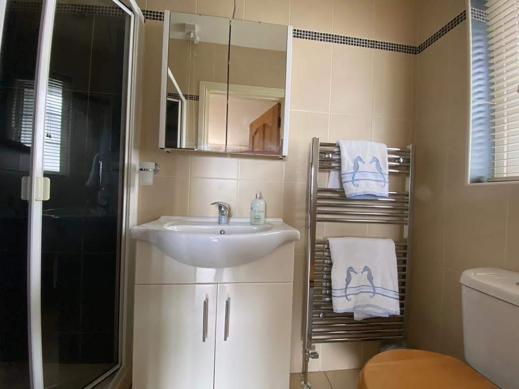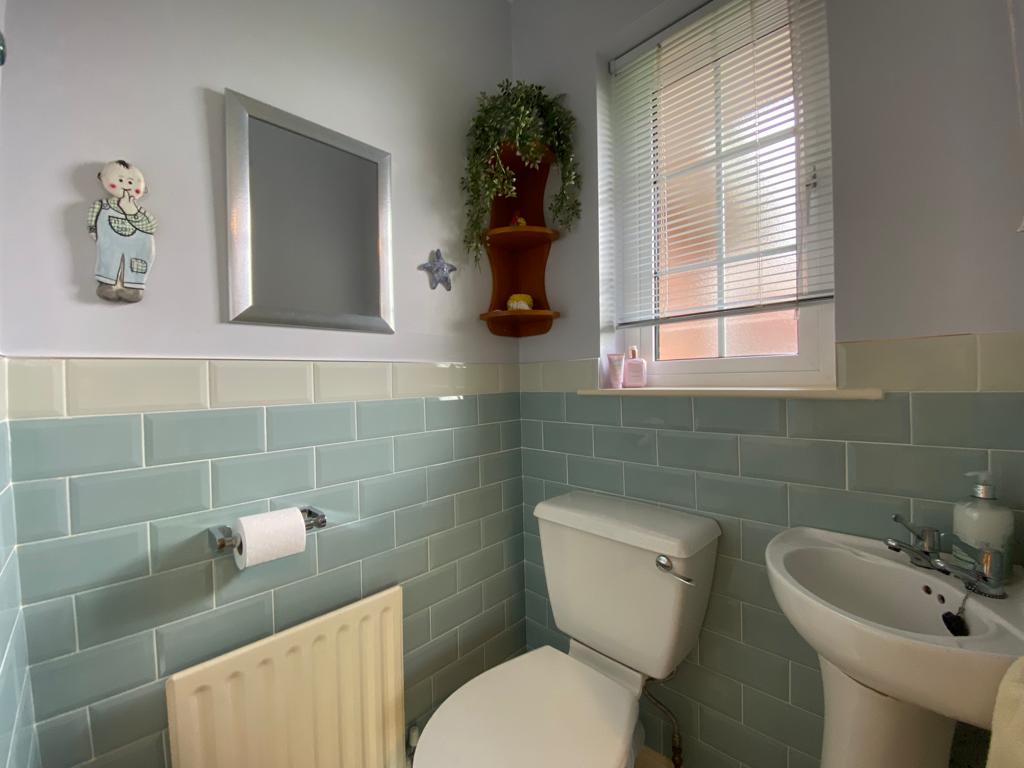 Comprising walk in electric shower, whb set in vanity unit, wc, chrome radiator, tiled walls and floor.