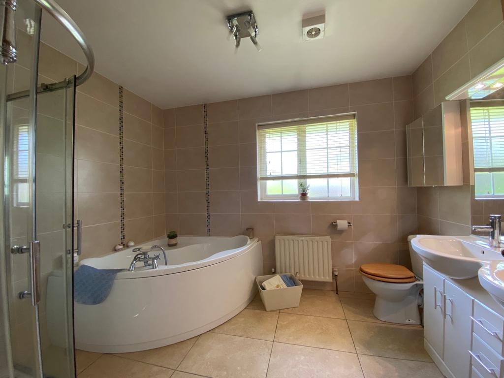 Comprising corner bath with shower fitting to taps, walk in power shower. `His & Her ` wash hand basins set in vanity unit, wc, tiled walls and floor.