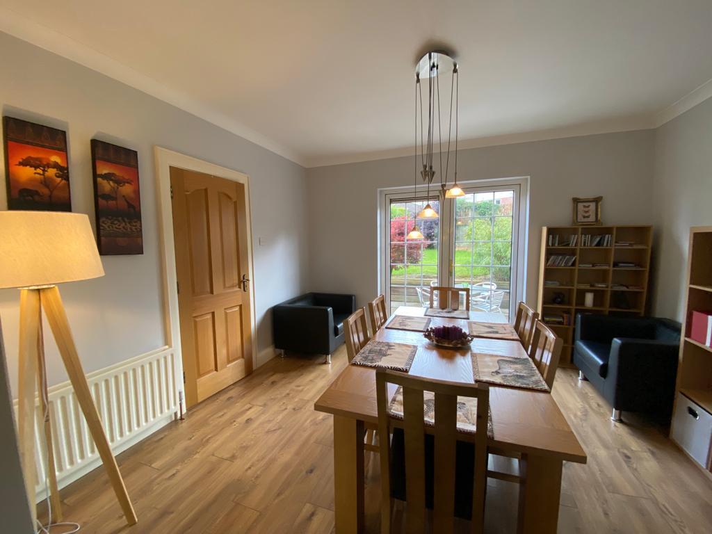 Having multi fuel stove set on granite hearth, ceiling cornicing, laminated wooden floor.
