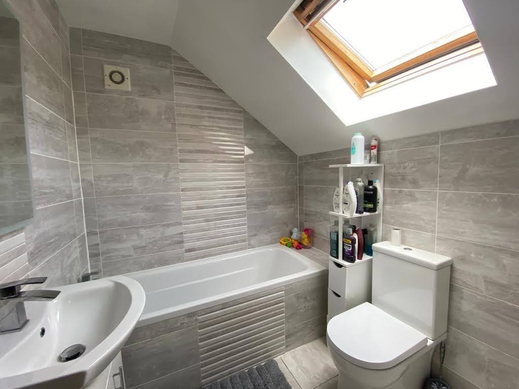 Comprising bath, whb and wc, tiled walls and floor.