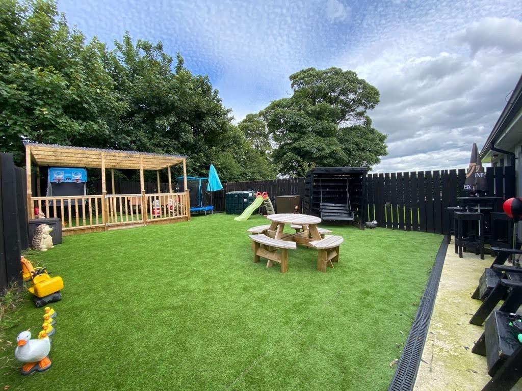 Lawn to rear laid in artificial grass and enclosed by fence and gate.`