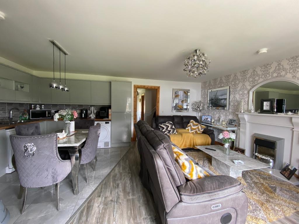 Having range of eye and low level units, tiling between units, 1 1/2 bowl single drainer stainless steel sink unit with mixer taps, hob, oven, stainless steel extractor hood, plumbed for washing machine and dishwasher, space for tumble dryer, dining space, tiled floor. Living area having laminated wooden floor.