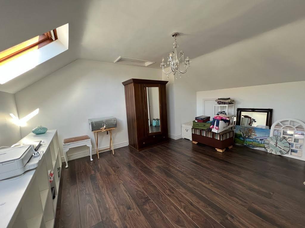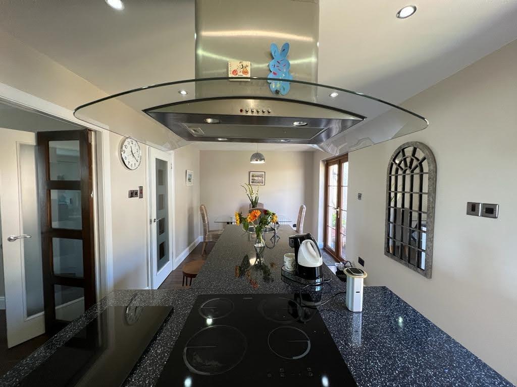 Having excellent range of units, centre island with sink unit, integrated dishwasher and and washing machine, additional storage and breakfast bar, hob, stainless steel extractor hood. There are also twin ovens and an integrated fridge / freezer, washing machine, recessed lighting, laminated wooden floor, French doors leading to rear.