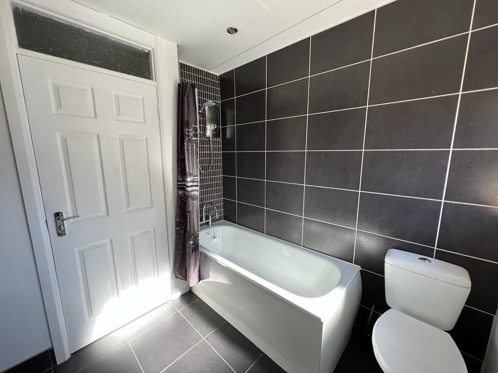 Comprising bath with electric shower over and tiling around, whb and wc, recessed lighting, tiled floor.