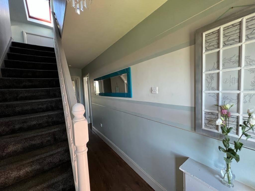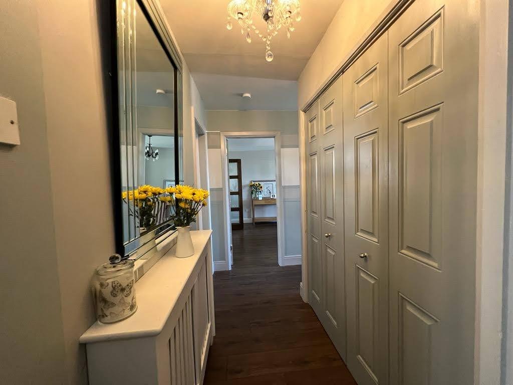 Having hotpress and airing cupboard, understairs storage, laminated wooden floor and glazed door leading to lounge.