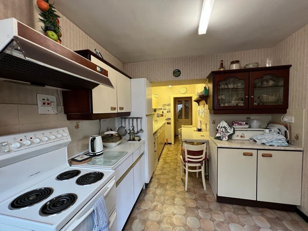 Having eye and low level units, single drainer stainless steel sink unit with mixer taps, wired for cooker, space for fridge, plumbed for dishwasher, larder.