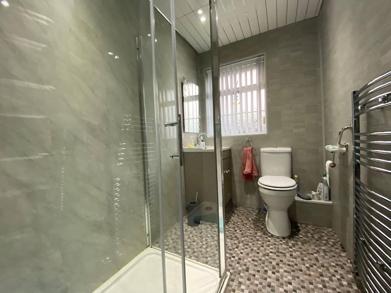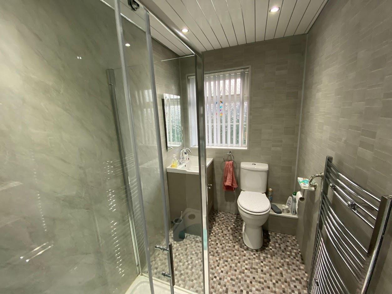 Comprising walk in shower with PVC cladding to walls, whb vanity unit, wc, PVC ceiling with spot lights.