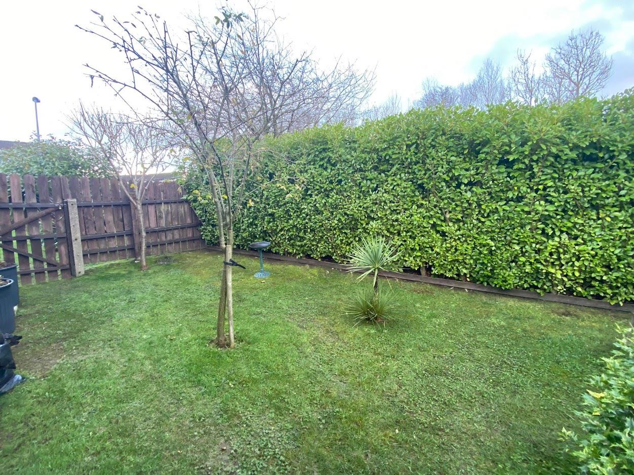 Garden to side enclosed by fence, hedge and trees.