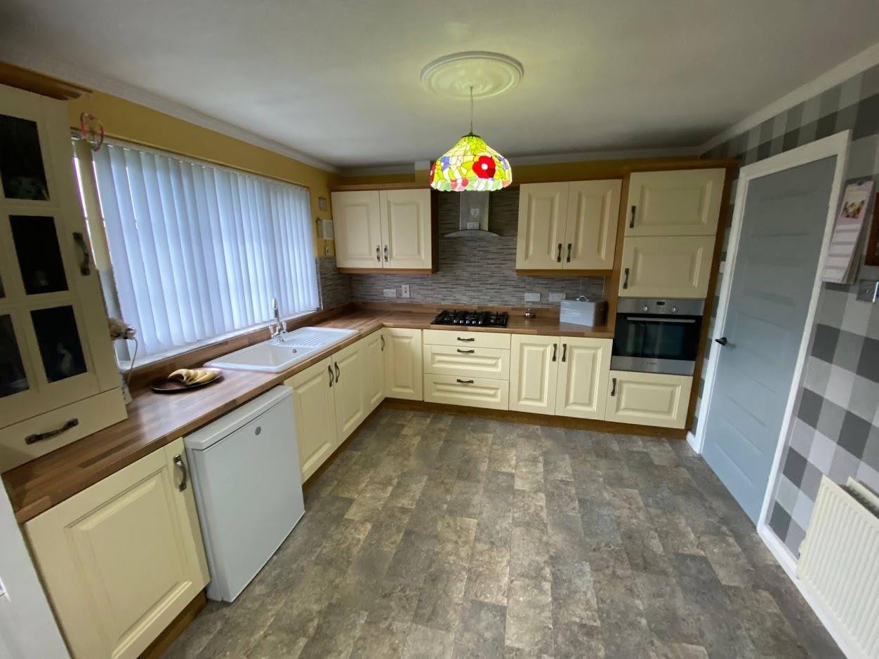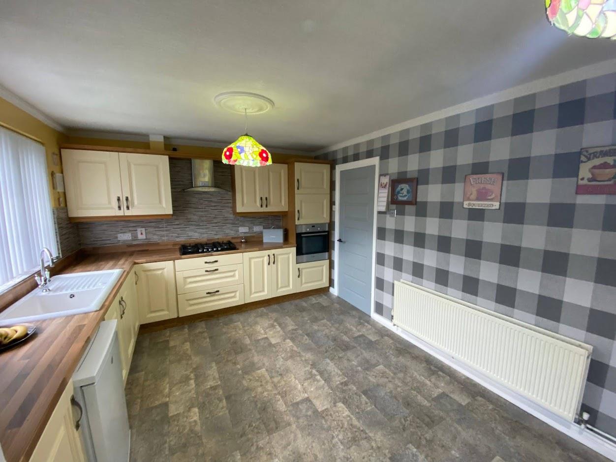 Having eye and low level units, tiling between units, glazed display cupboards with under lighting, Belfast sink with mixer taps, gas hob, oven, stainless steel extractor hood, space for fridge, ceiling cornicing.