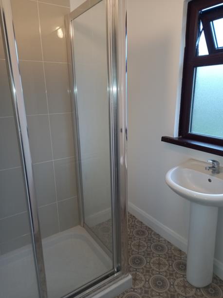 Comprising electric shower; wash hand basin and WC; part tiling around shower; tiled floor