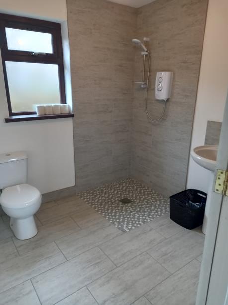 Comprising tiled walk in shower; wash hand basin.