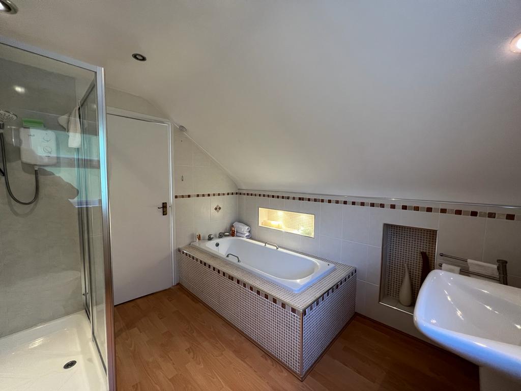 Comprising bath, walk in electric shower with PVC cladding to walls, whb and wc, recessed lighting, tiled walls, laminated wooden floor.