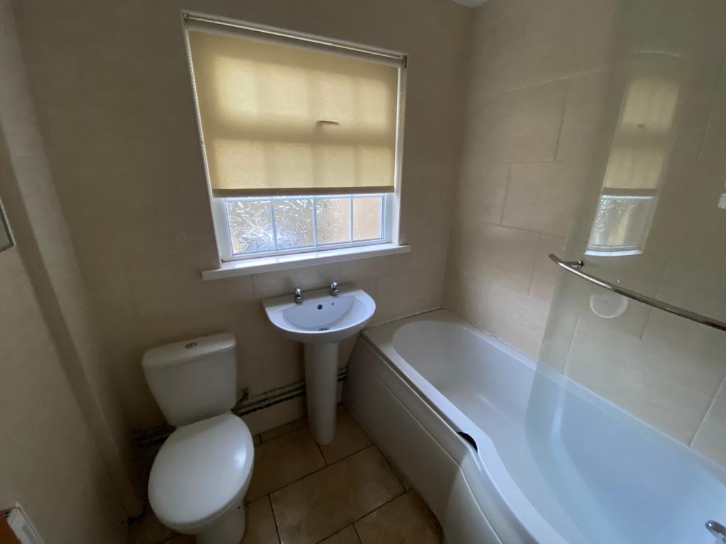 Comprising bath, whb and wc, fully tiled walls, tiled floor.