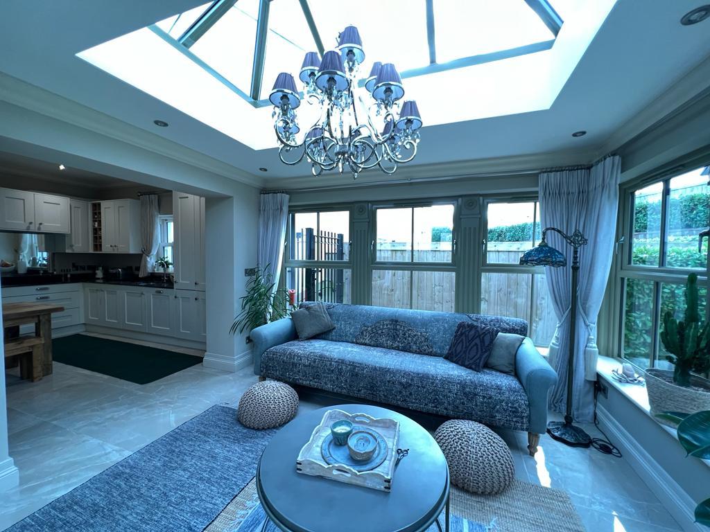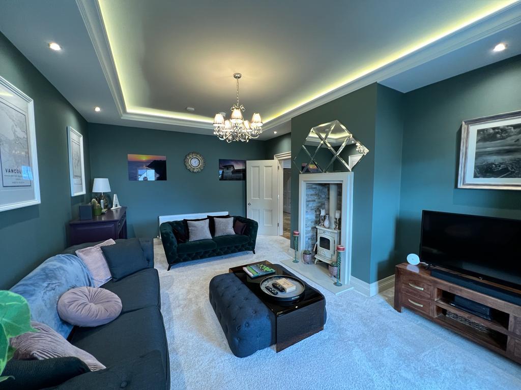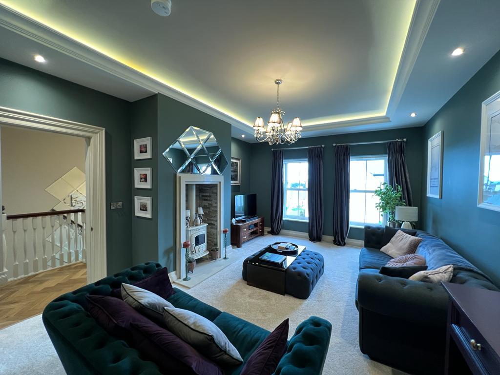 Having multi fuel stove set in brick surround, drop ceiling with concealed lighting.