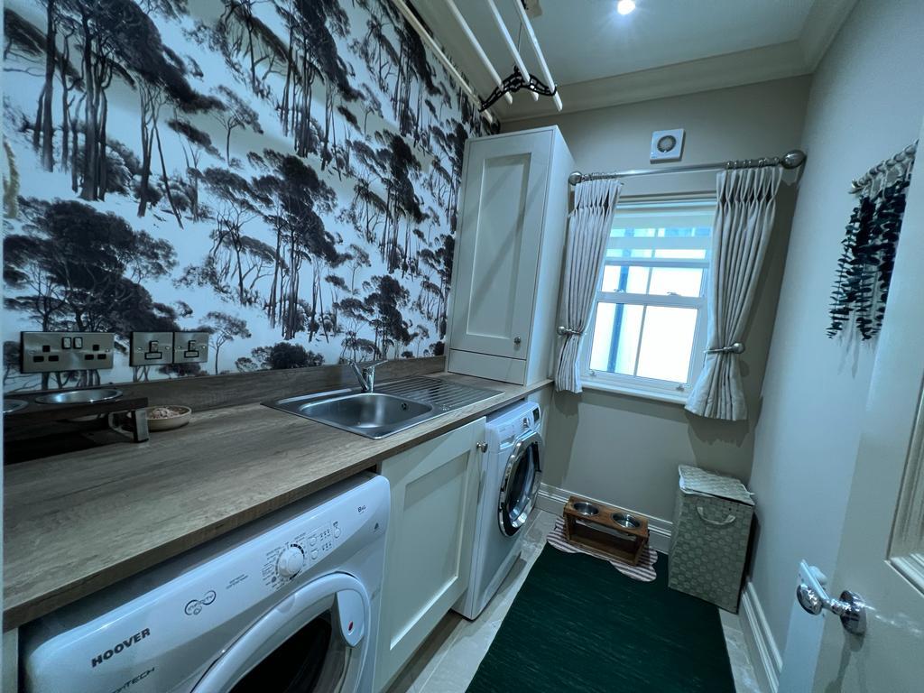 Having fitted units, single drainer stainless steel sink unit with mixer taps, plumbed for washing machine, space for tumble dryer, tiled floor.