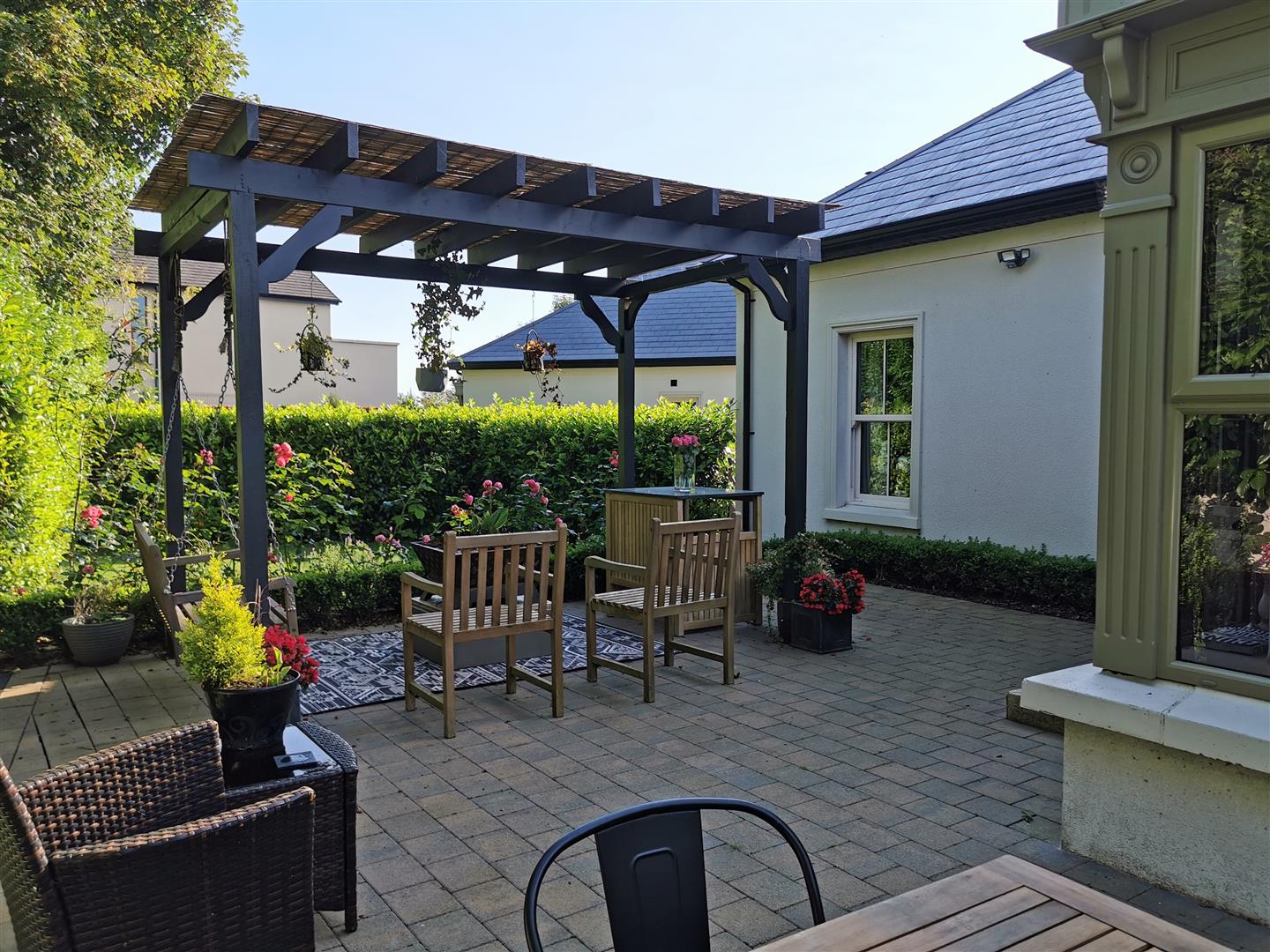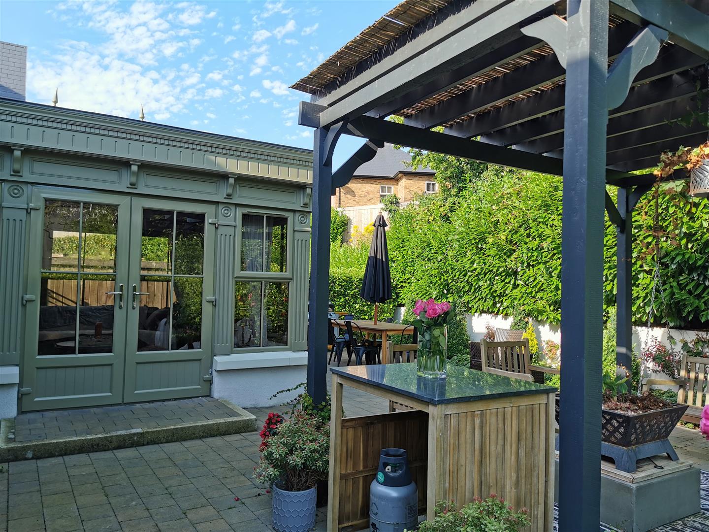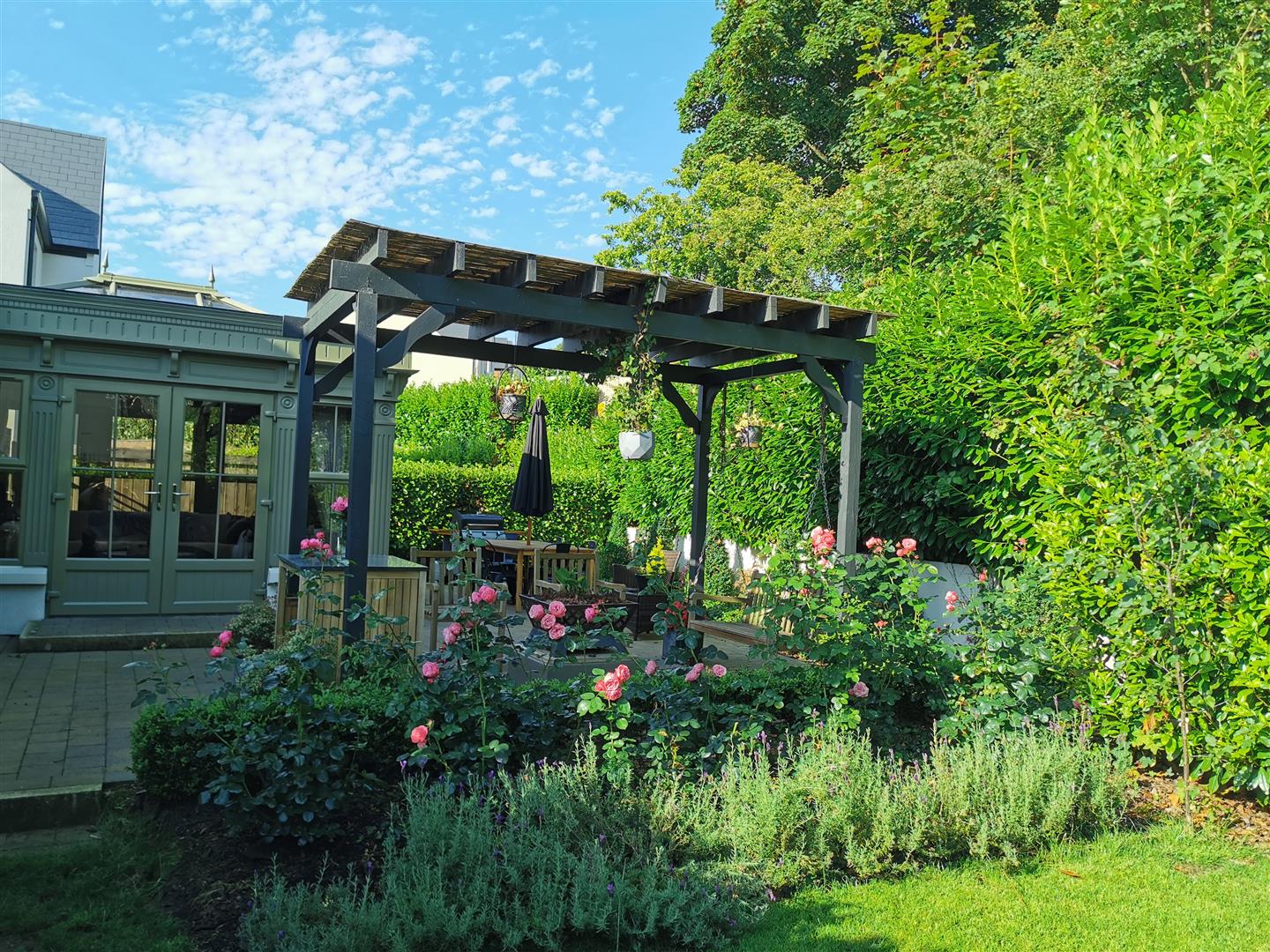 Lawn to rear bordered by mature Laurel hedging and wall.
