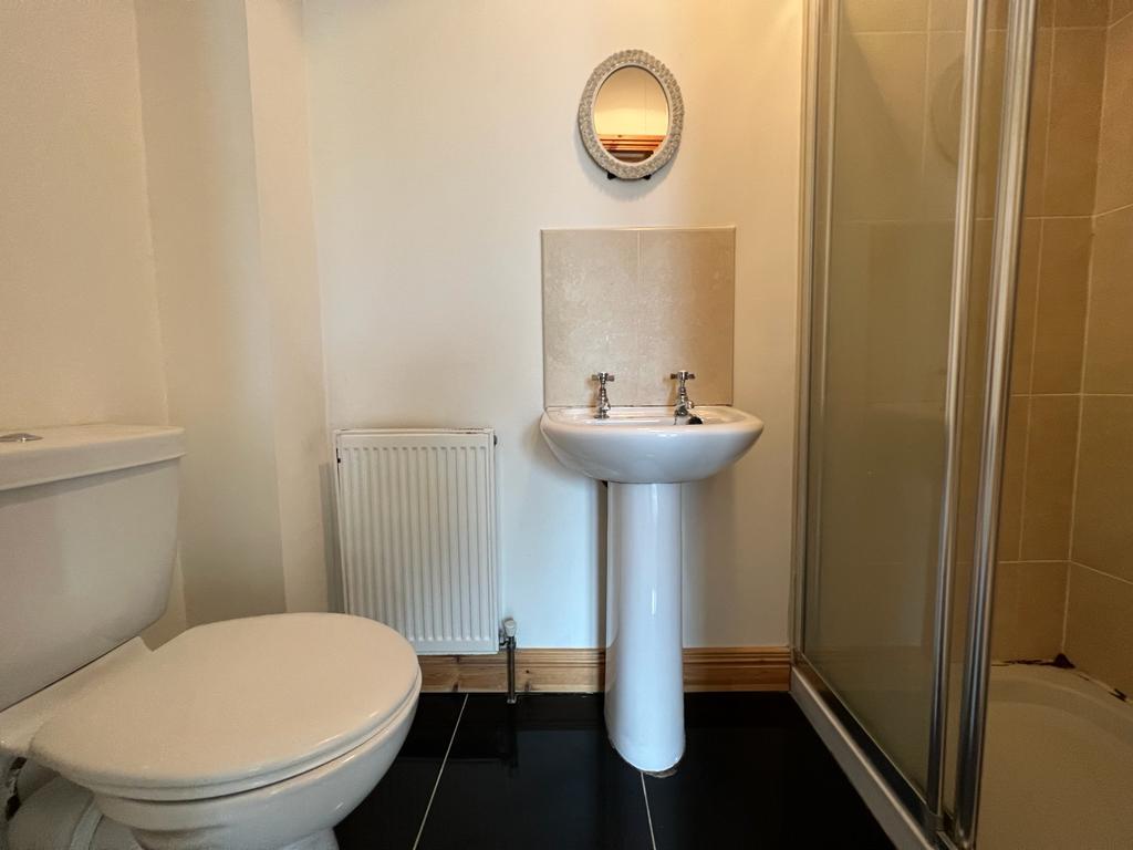 Comprising tiled walk in shower, whb and wc, tiled floor.