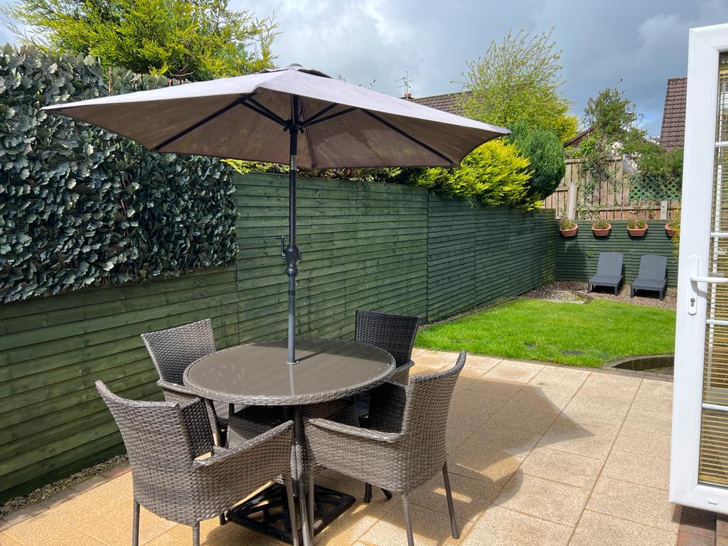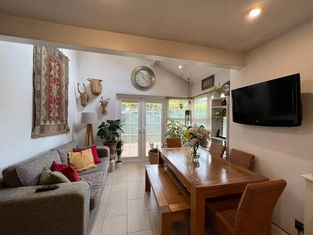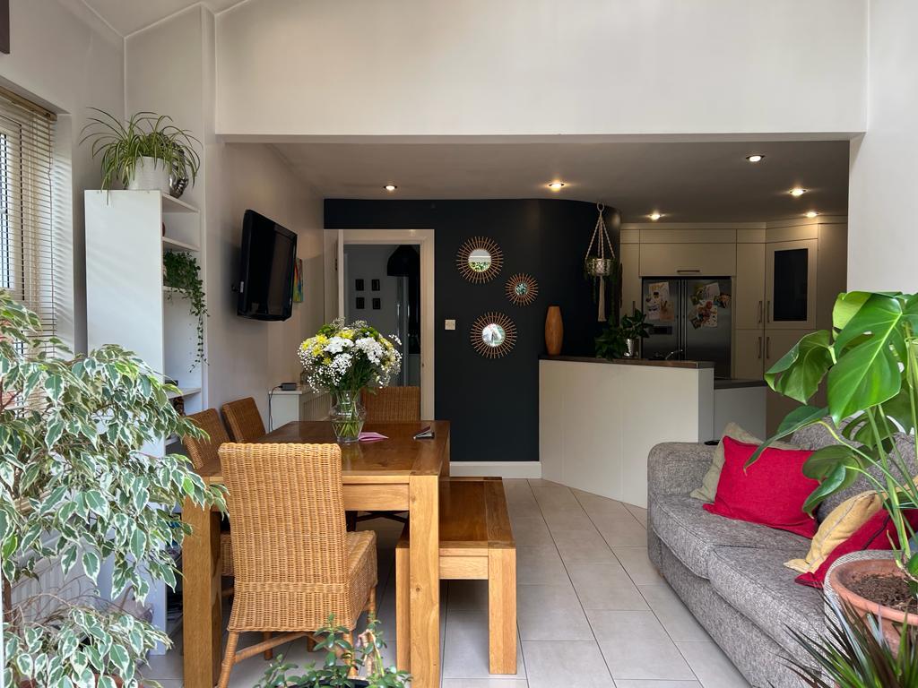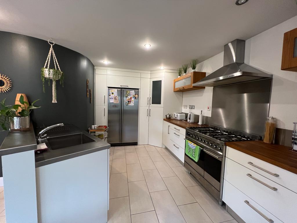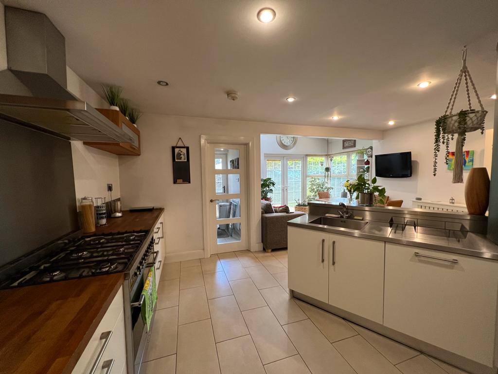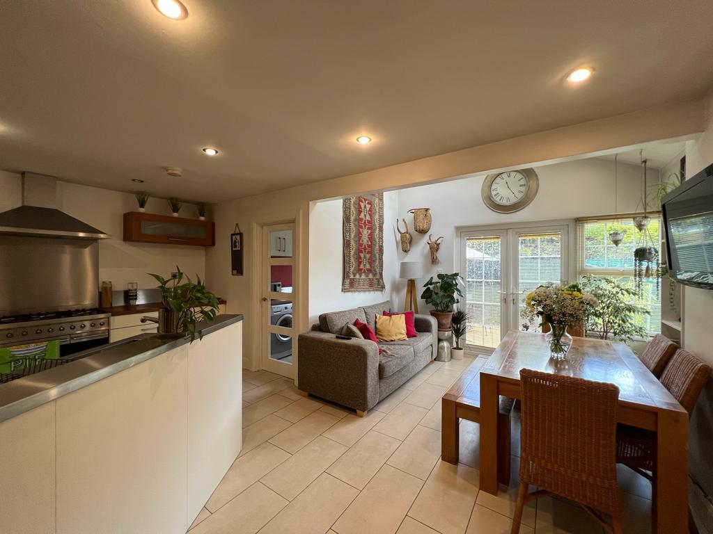 Having excellent range of eye and low level units, stainless steel sink unit, space for cooking centre, stainless steel extractor hood, integrated dishwasher, space for fridge / freezer, recessed ceiling lighting, ample dining / family space, French doors leading to garden, tiled floor.