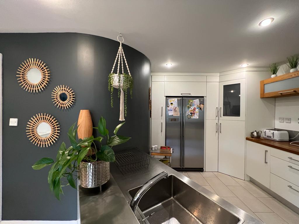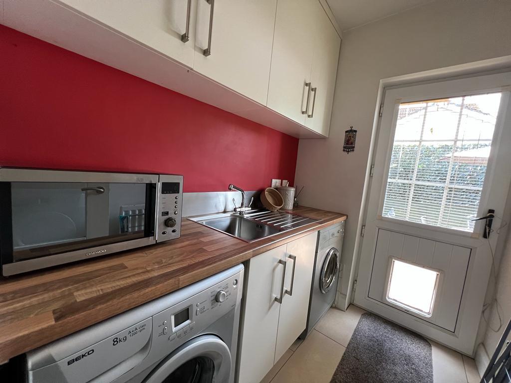 Having eye and low level units, single drainer stainless steel sink unit with mixer taps, plumbed for washing machine, space for tumble dryer, tiled floor.