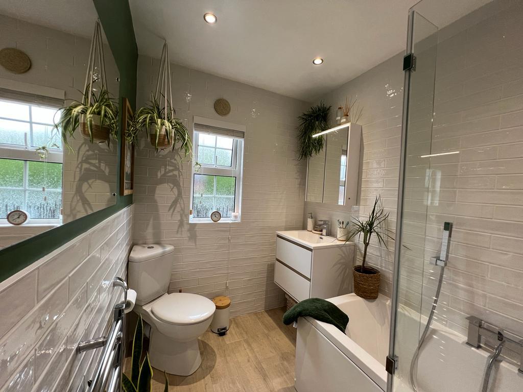 Comprising bath with shower over, shower screen, whb set in vanity unit, wc, wall tiling, tiled floor.