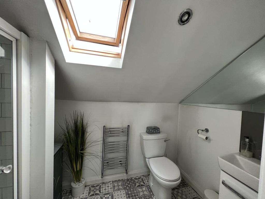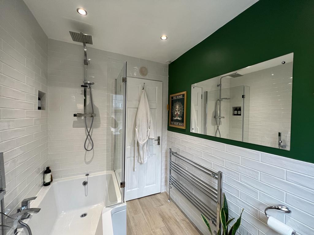 Comprising fully tiled walk in electric shower, whb set in vanity unit, chrome radiator, tiled floor.