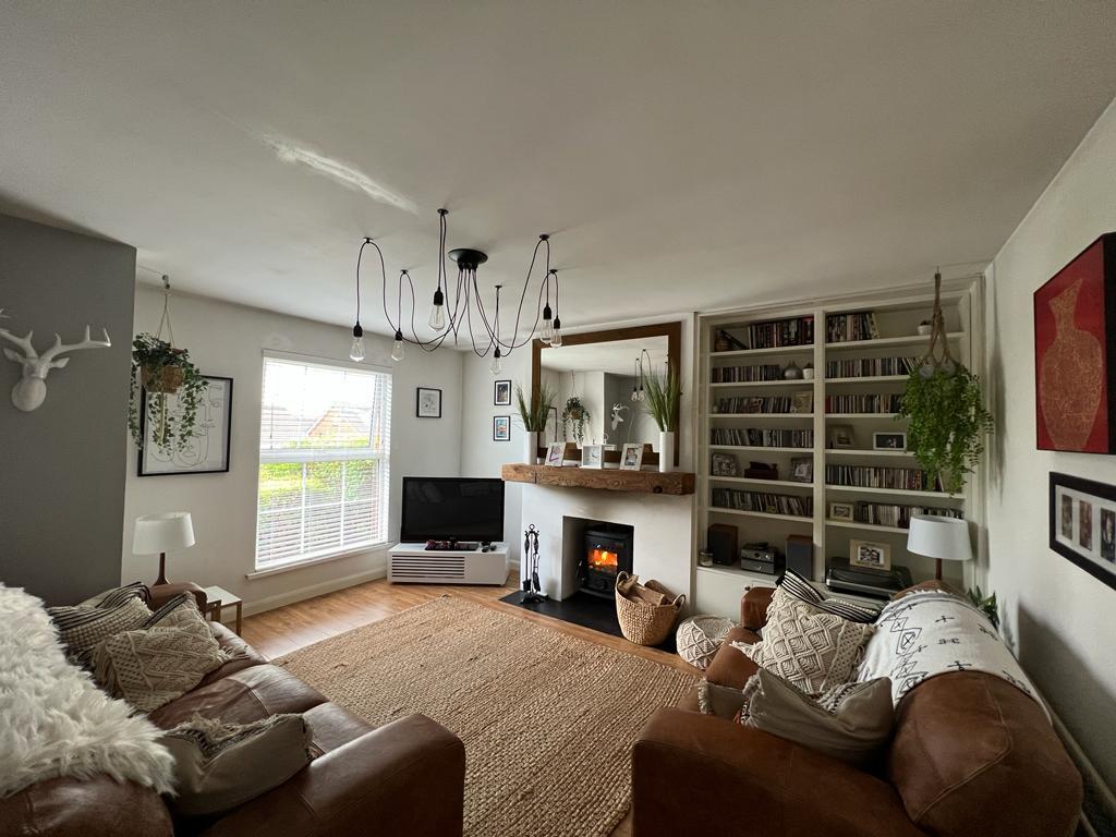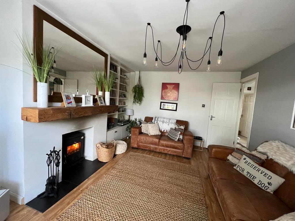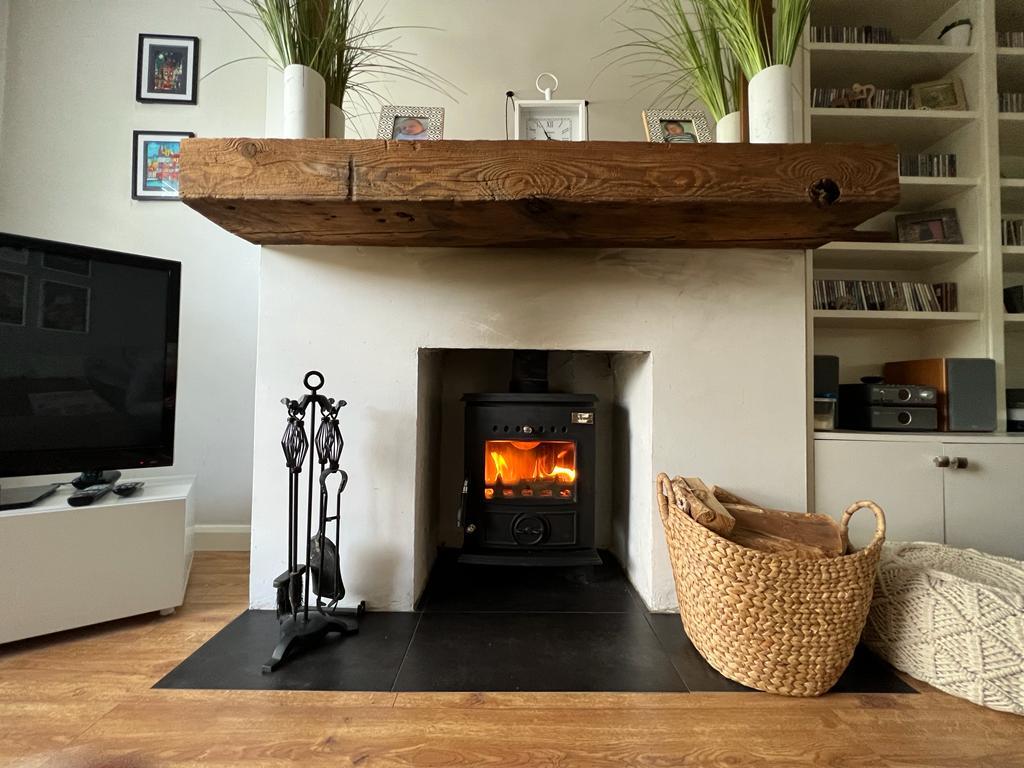 Having multi fuel stove set in hole in wall style fireplace, tiled hearth, laminated wooden floor.