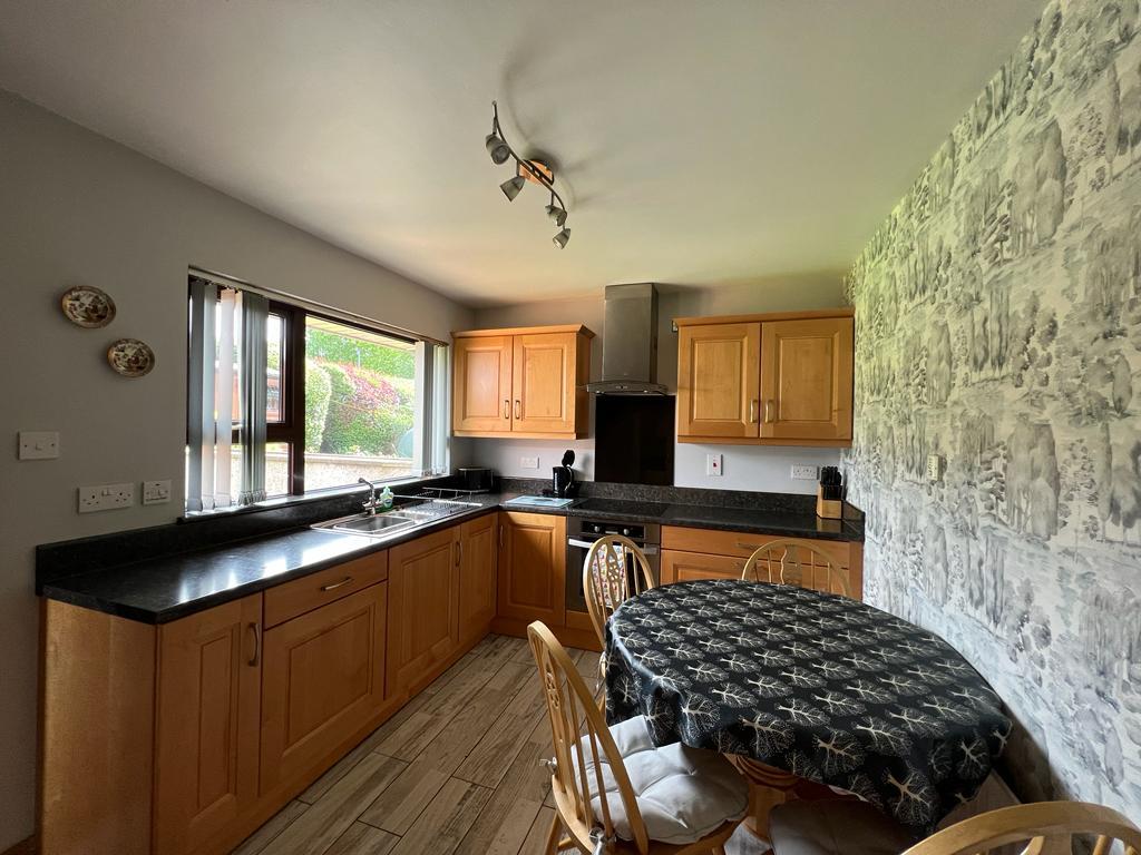Having eye and low level units, hob, underoven, stainless steel extractor hood, integrated fridge / freezer, integrated dishwasher, dining space, tiled floor.