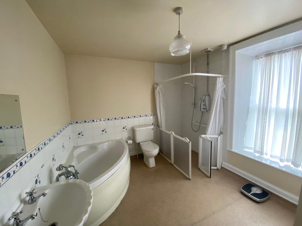 Comprising corner bath with tiling around, fully tiled shower, whb and wc, extractor fan, hotpress.