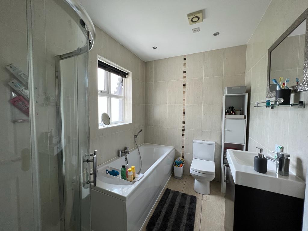 Comprising electric shower, whb and wc, fully tiled walls and floor.