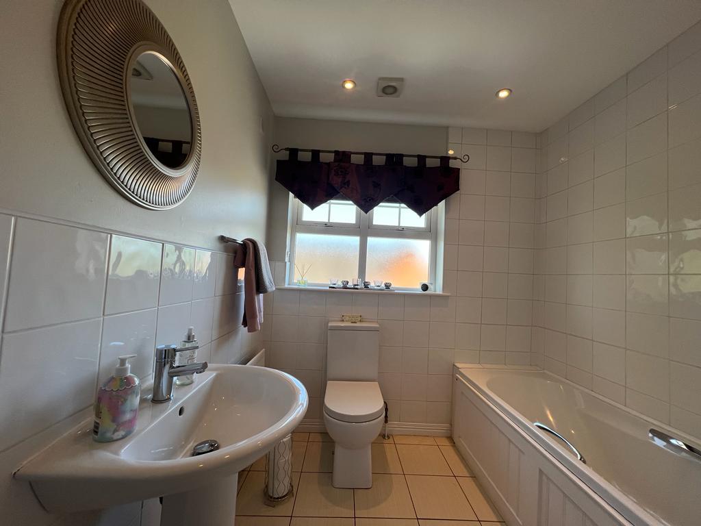 Comprising bath with handles, electric shower over, fully tiled around bath, shower screen, whb and wc, recessed lighting, remaining walls 1/2 tiled, tiled floor.