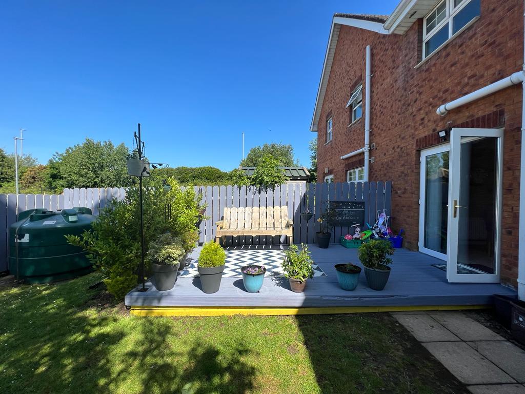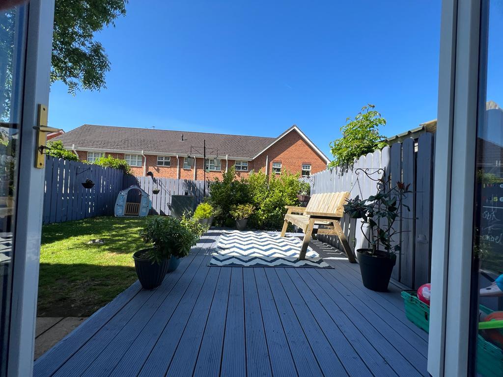 Decked patio area leading to rear lawn.