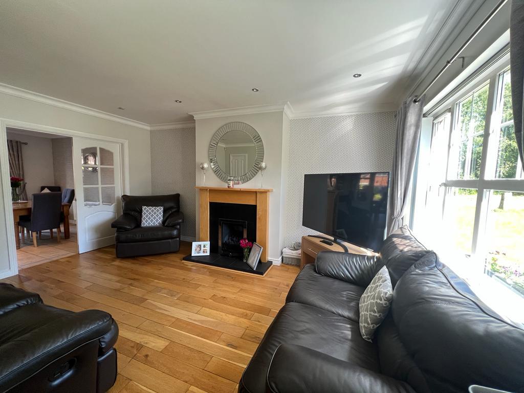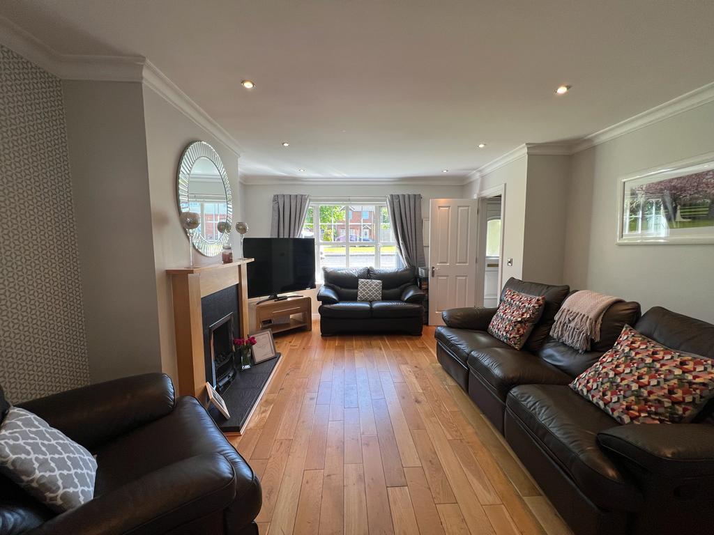 Having attractive fireplace with gas inset, ceiling cornicing, recessed lighting, understairs storage, double doors leading to Kitchen.