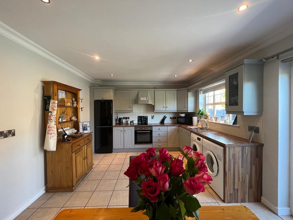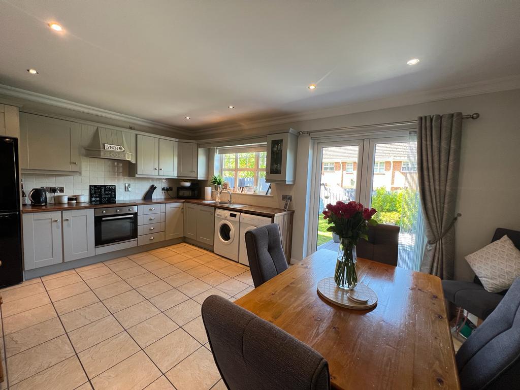 Having range of eye and low level units, tiling between units, matching pelmet over window, single drainer stainless steel sink unit wth mixer taps, hob, underoven, extractor hood, plumbed for washing machine, space for tumble dryer, space for fridge / freezer, recessed lighting, dining space with French doors leading to rear, ceiling cornicing, tiled floor.